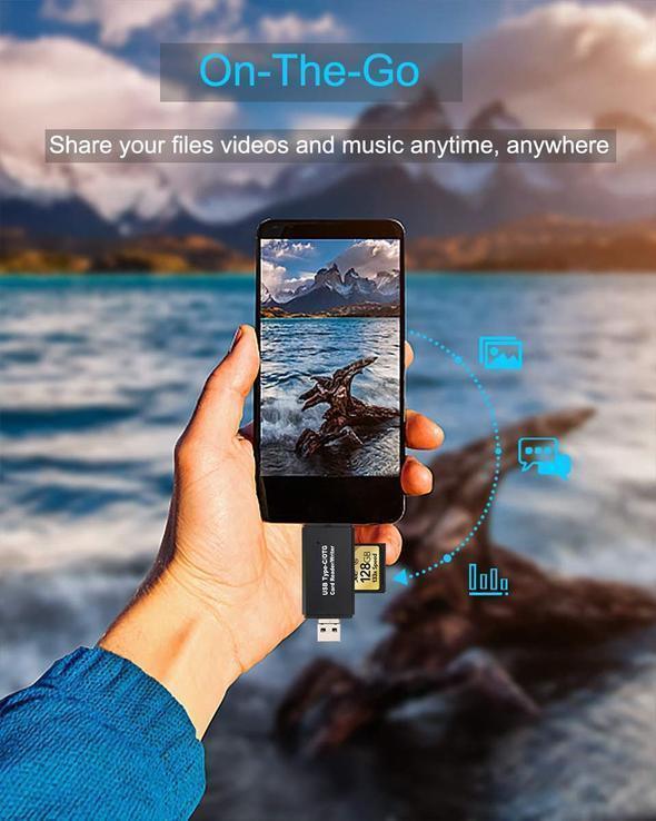- The standard USB 2.0 plug (type A) and micro USB plug (type B) combination, making the card reader compatible with all tablets and Android smartphones that support OTG function.
